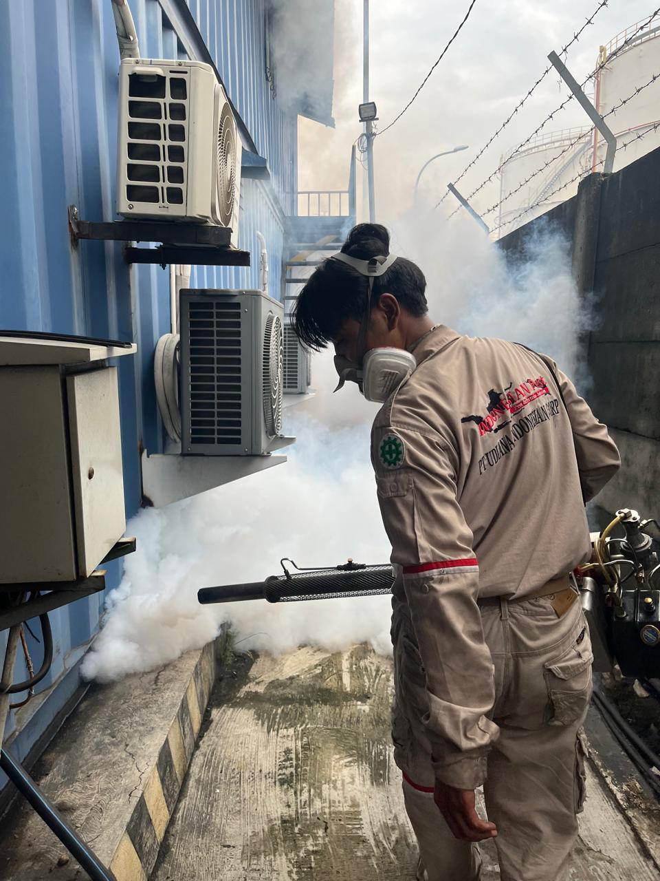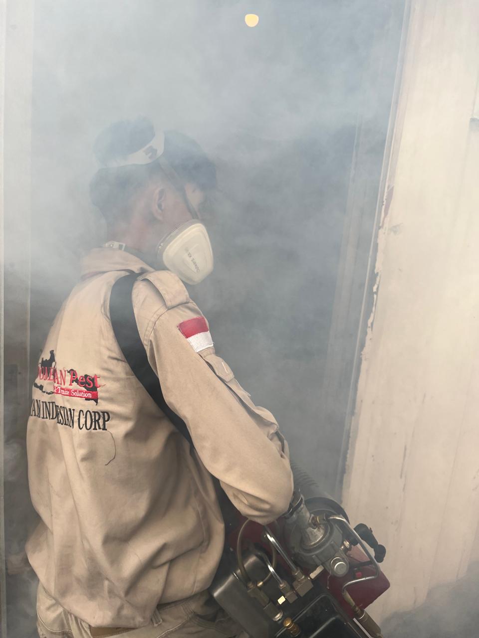 Layanan jasa fumigasi profesional untuk membasmi hama di area tertutup seperti gudang dan pabrik.